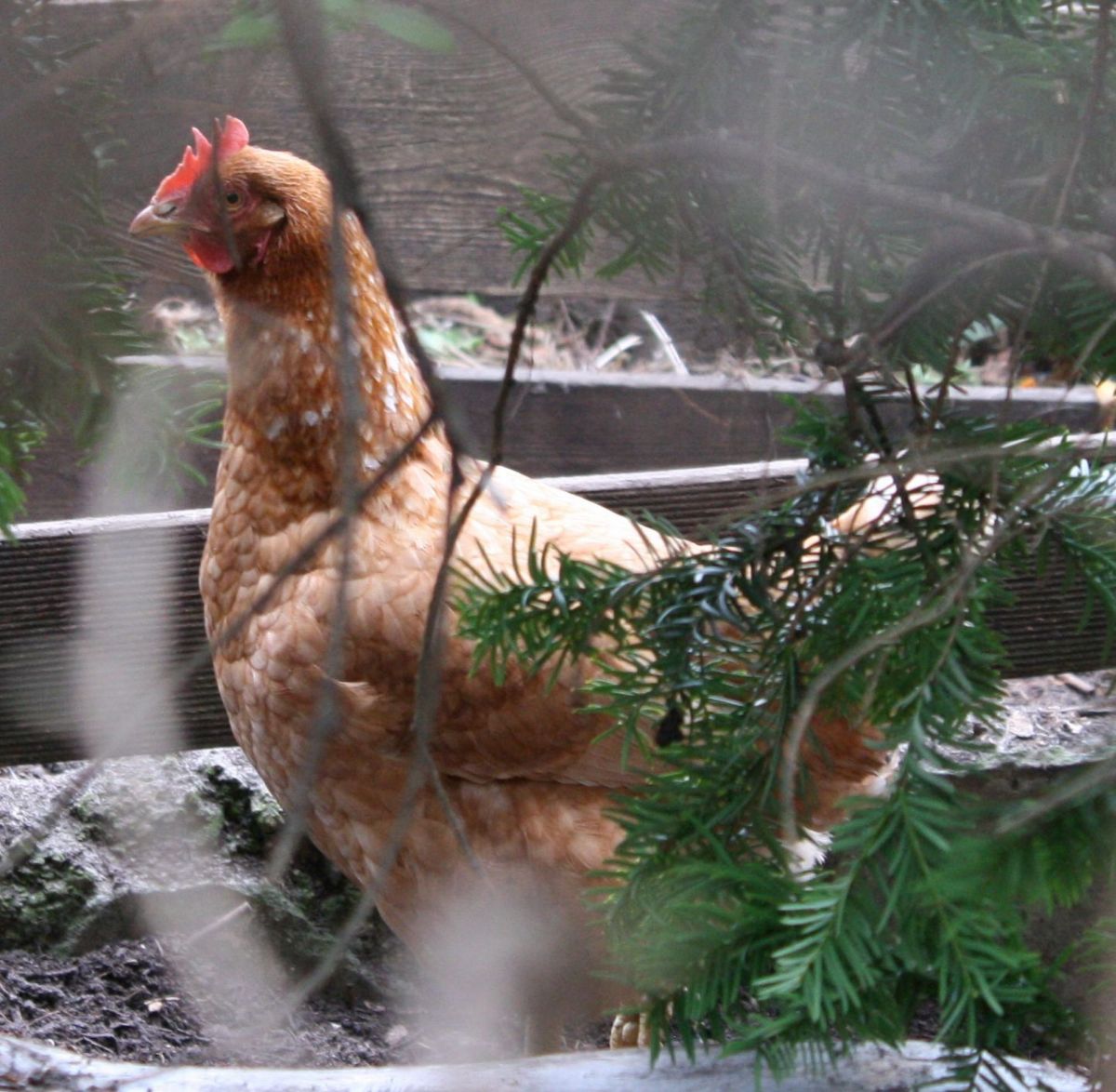 jedoch hier ein Huhn hinter Zäunen.