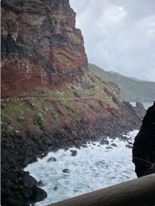 - Dort hat die Inselverwaltung vom großen Parkplatz aus einen steilen urlangen Holzsteg/Laufweg in die Wände der Vulkanfelsen gehauen, welcher teilweise unter überhängenden Felsen hinab zu einem schwarzen Strand führt. Das Mitführen eines Sicherheitshelmes könnte durchaus sinnvoll sein da die unzähligen Treppenstufen mit kleineren und größeren Felsbruchsteinen übersät waren. Das ganze dortige Szenario (Felsformationen, Streckenführung, Meeresbrandung) .... hat etwas Urzeitliches. Vor dem Strand gibt es eine große finstere Höhle mit einem kleineren Teich/See (GPS ungefähr 28.758948° , -17.737840°), in die man fast reinklettern kann. Das Wasser dieser Höhlengrotte ist anscheinend unterirdisch irgendwie mit dem Meer verbunden. Man sollte eine Taschenlampe mitnehmen, wenn man diese erkunden will und besser rutschfestes Schuhwerk tragen.